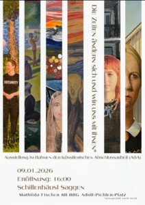 Die Maturantin Maturantin, wird am 9. Jänner um 16 h ihre vorwissenschaftliche Arbeit im Schillerhäusl vorstellen und AUSSTELLEN – schaut vorbei! Sie präsentiert unter dem Motto „Die Zeiten ändern sich und wir uns mit ihnen“ (sinngemäß nach Ovid) ihre künstlerische Abschlussarbeit (8B, BRG Adolf-Pichler-Platz) – ein Special!